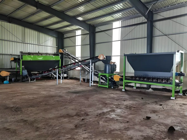 槽式翻拋機→攪拌機→半濕物料粉碎機→滾筒篩分機→自動包裝機